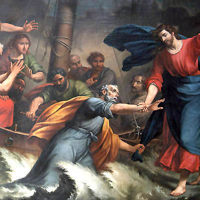[Dopo che la folla ebbe mangiato], subito Gesù costrinse i discepoli a salire sulla barca e a precederlo sull’altra riva, finché non avesse congedato la folla. Congedata la folla, salì sul monte, in disparte, a pregare. Venuta la sera, egli se ne stava lassù, da solo. La barca intanto distava già molte miglia da terra ed era agitata dalle onde: il vento infatti era contrario. Sul finire della notte egli andò verso di loro camminando sul mare. Vedendolo camminare sul mare, i discepoli furono sconvolti e dissero: «È un fantasma!» e gridarono dalla paura. Ma subito Gesù parlò loro dicendo: «Coraggio, sono io, non abbiate paura!». Pietro allora gli rispose: «Signore, se sei tu, comandami di venire verso di te sulle acque». Ed egli disse: «Vieni!». Pietro scese dalla barca, si mise a camminare sulle acque e andò verso Gesù. Ma, vedendo che il vento era forte, s’impaurì e, cominciando ad affondare, gridò: «Signore, salvami!». E subito Gesù tese la mano, lo afferrò e gli disse: «Uomo di poca fede, perché hai dubitato?». Appena saliti sulla barca, il vento cessò. Quelli che erano sulla barca si prostrarono davanti a lui, dicendo: «Davvero tu sei Figlio di Dio!».