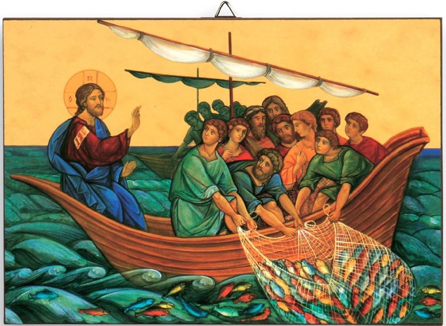 In quel tempo, mentre la folla gli faceva ressa attorno per ascoltare la parola di Dio, Gesù, stando presso il lago di Gennèsaret, vide due barche accostate alla sponda. I pescatori erano scesi e lavavano le reti. Salì in una barca, che era di Simone, e lo pregò di scostarsi un poco da terra. Sedette e insegnava alle folle dalla barca. Quando ebbe finito di parlare, disse a Simone: «Prendi il largo e gettate le vostre reti per la pesca». Simone rispose: «Maestro, abbiamo faticato tutta la notte e non abbiamo preso nulla; ma sulla tua parola getterò le reti». Fecero così e presero una quantità enorme di pesci e le loro reti quasi si rompevano. Allora fecero cenno ai compagni dell’altra barca, che venissero ad aiutarli. Essi vennero e riempirono tutte e due le barche fino a farle quasi affondare. Al vedere questo, Simon Pietro si gettò alle ginocchia di Gesù, dicendo: «Signore, allontànati da me, perché sono un peccatore». Lo stupore infatti aveva invaso lui e tutti quelli che erano con lui, per la pesca che avevano fatto; così pure Giacomo e Giovanni, figli di Zebedèo, che erano soci di Simone. Gesù disse a Simone: «Non temere; d’ora in poi sarai pescatore di uomini». E, tirate le barche a terra, lasciarono tutto e lo seguirono.